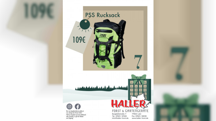 Der PSS Rucksack bietet Platz für Ausrüstung und Tagesgepäck. Strapazierfähig und bequem. Heute für 109 Euro bei Haller Forst und Gartengeräte. Solange verfügbar.